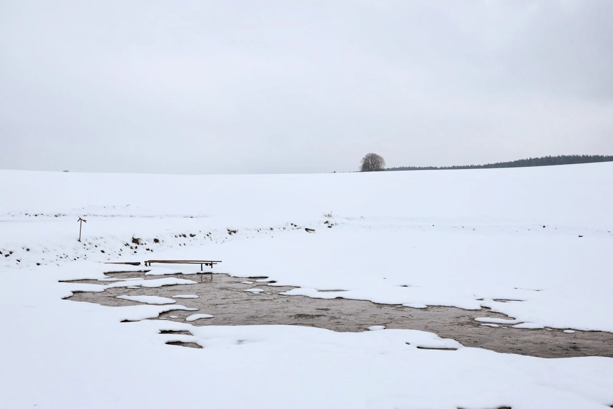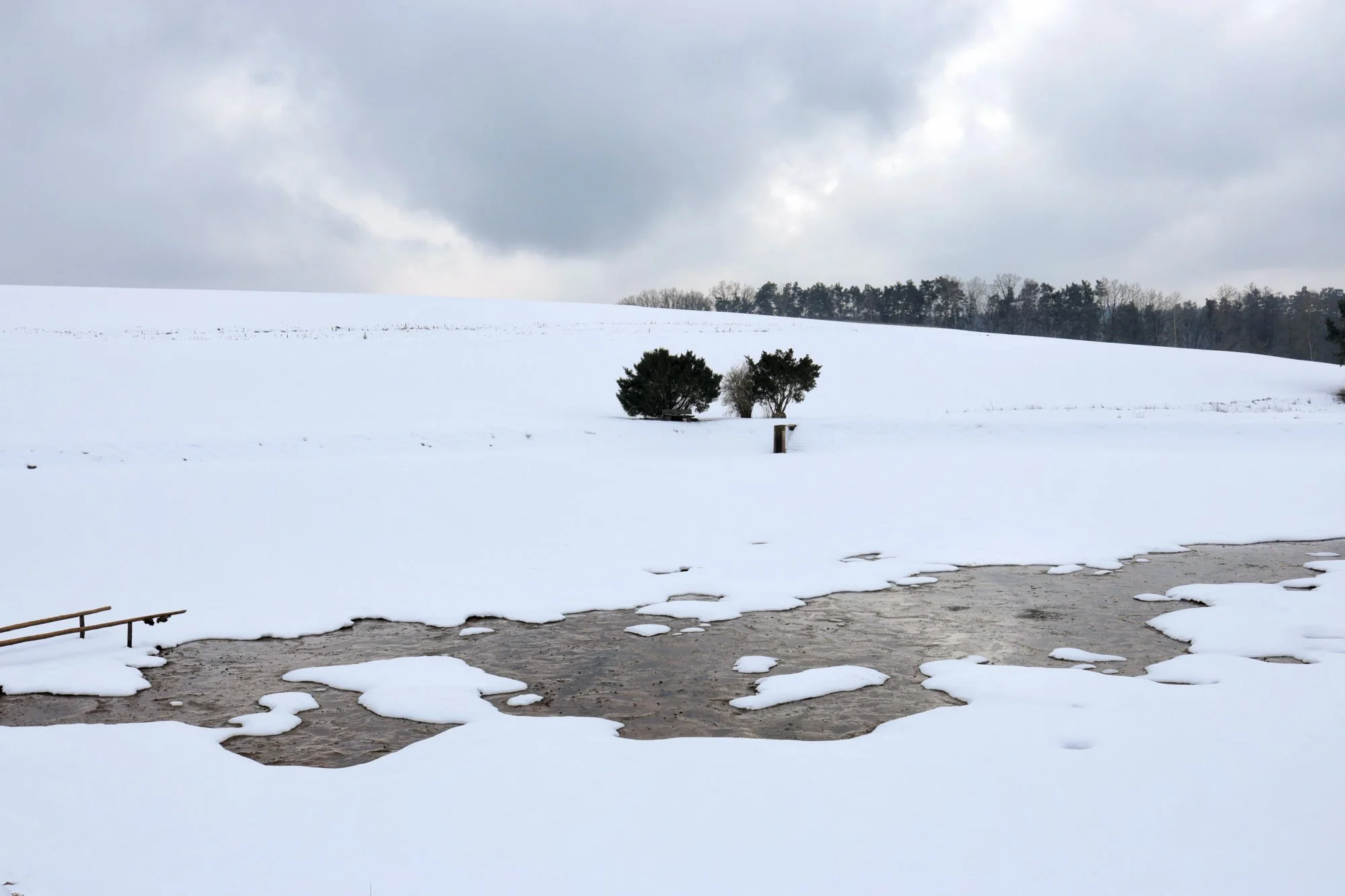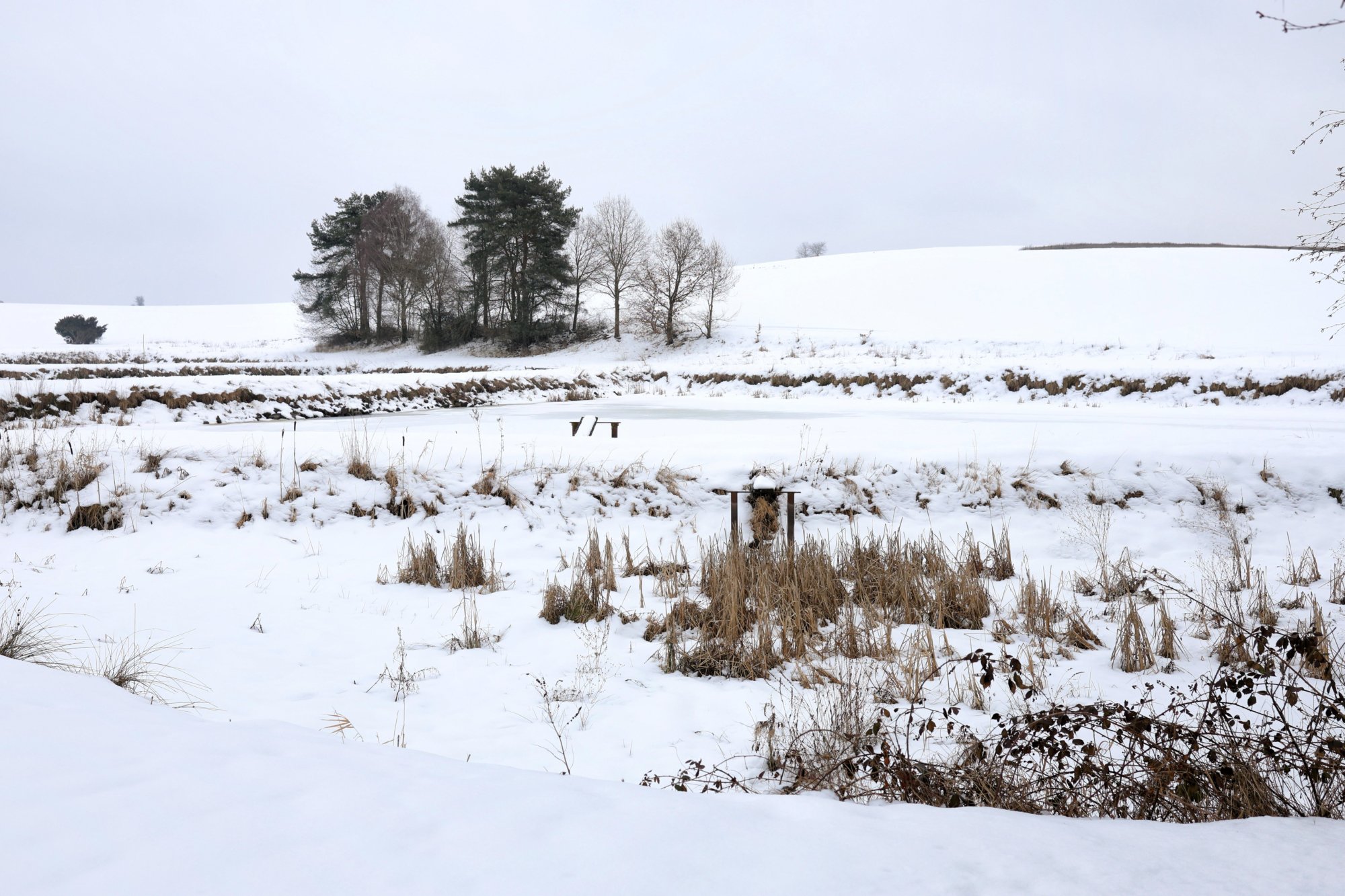 Die kleinen Weiher liegen da wie früher, nur dass jetzt statt Eisfläche ein trüber, etwas angetauter Spiegel vor einem liegt. Zumal man die Wiesen gar nicht von einem Weiher unterscheiden kann. Kein schönes Winterbild, kein Frühlingsversprechen – einfach nur Zwischenzustand.